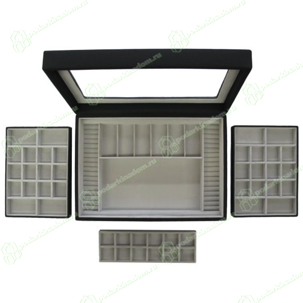 Внизу: одно большое отделение, вынимающейся лоток на 12 секций, 6 дополнительных отделений и два отделения с валиками для колец.