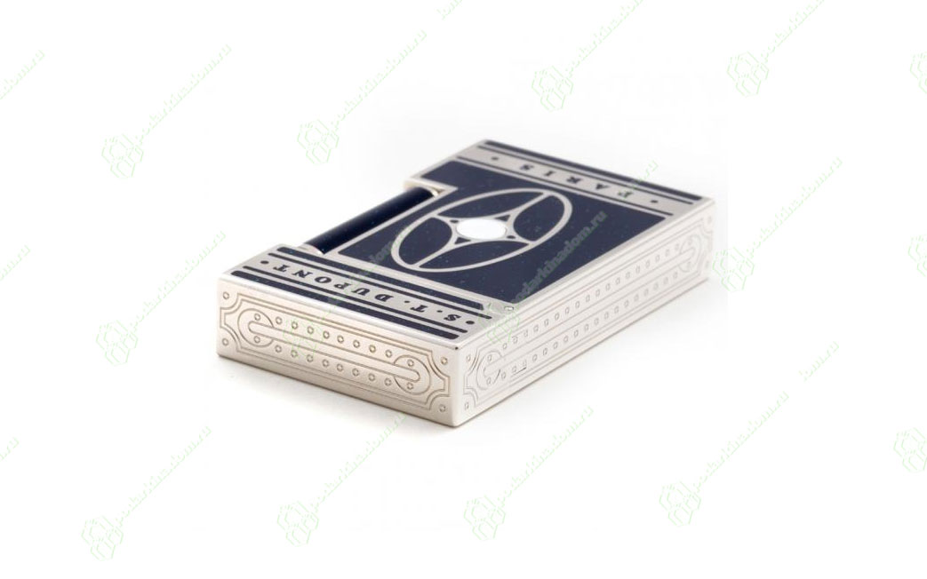 Лимитированная серия газовых зажигалок «Восточный экспресс». Центральную часть украшает вставка из перламутра, корпус палладий с отделкой синим лаком 1883 экземпляра.